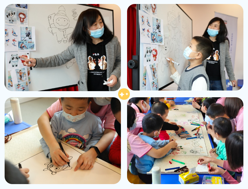 在精彩的热身之后,由二里庄小区住户,同时是一位美术老师的石力竹老师与孩子们共绘冬奥画卷。老师先分布为大家介绍冰墩墩、白鸽等元素,再鼓励每一位孩子独立创作,在老师最终的调整完善下,与孩子们孩子们共同完成了一幅完整的献礼冬奥作品,呈现了一副代表着健康、活力、欢乐的“冬奥”景象。