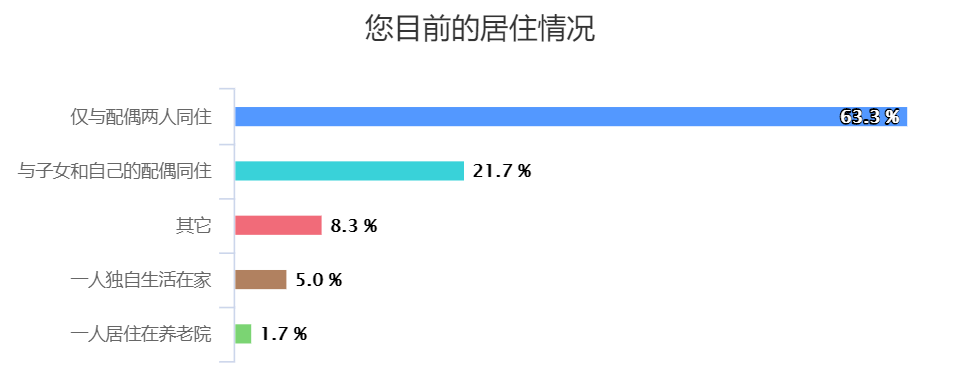 调研结果显示,仅与配偶二人共同居住的人数占到63.3%,是目前老年人居住的主要形式,部分老年人因为子女在外打工,帮忙照看孙辈,出现空巢和留守儿童双重情况家庭。因此社区养老服务可以的弥补家庭养老的不足,尤其是无子女照料或子女不在身边的老年人;并且可以填补机构养老价格过于昂贵普通家庭难以承担的空缺。
